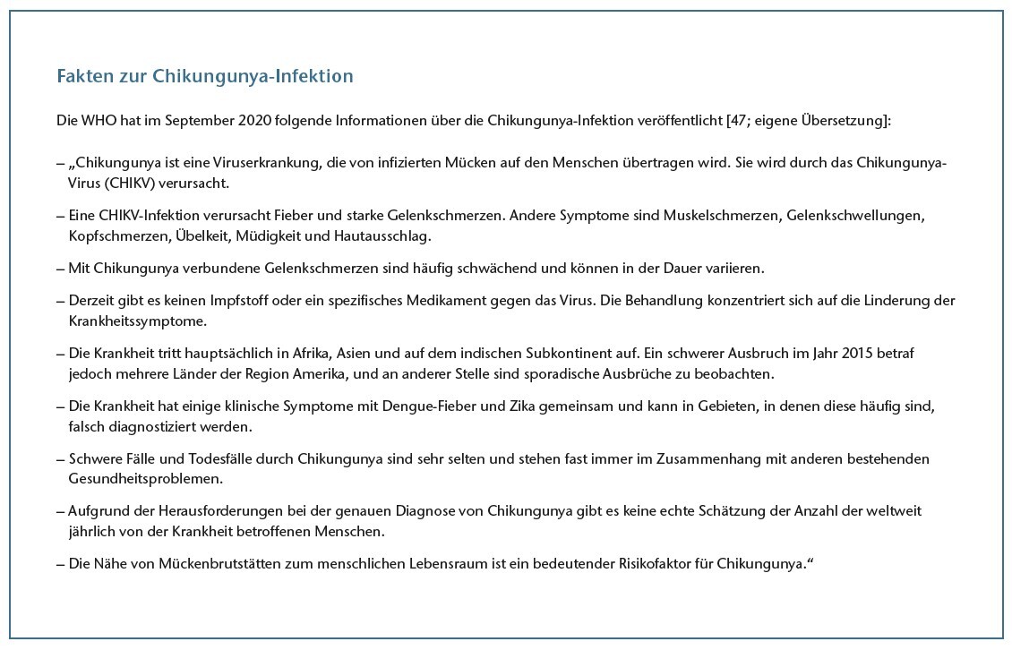Die seltene Chikungunya-Viruserkrankung (s. Fakten zur Chikungunya-Infektion) aus dem asiatischen Raum breitet sich weltweit immer weiter aus 8. Auch aus Deutschland werden immer mehr Erkrankungen gemeldet. Laut Robert Koch-Institut (RKI) wurden im Jahr 2018 insgesamt 28 Chikungunya-Infektionen in Deutschland diagnostiziert 9. Neben hohem Fieber sind starke Muskel- und Gelenkschmerzen typische Chikungunya-Symptome. Diese sind teilweise so schwer erträglich, dass Betroffene kaum stehen und nur eingeschränkt gehen können. Jüngste Studien weisen darauf hin, dass sich das Virus auch mit einer peripheren Polyneuropathie assoziieren lässt 10 11. In der biologischen Fachliteratur wird die Krankheit seit Auftreten eines Peaks im Jahr 2014 in Europa verstärkt diskutiert 12 13, bislang allerdings nicht im Zusammenhang mit Aspekten der Orthopädietechnik oder der Physiotherapie. Insofern bestehen hierzu derzeit auch keine Handlungsempfehlungen.