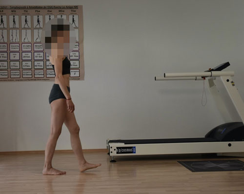 - „loading response“: Gehen an einer Linie zur visuellen Orientierung zur Korrektur des Crossovers. Die Füße mussten immer direkt rechts bzw. links von der Linie platziert werden (Stürze können so vermieden werden);