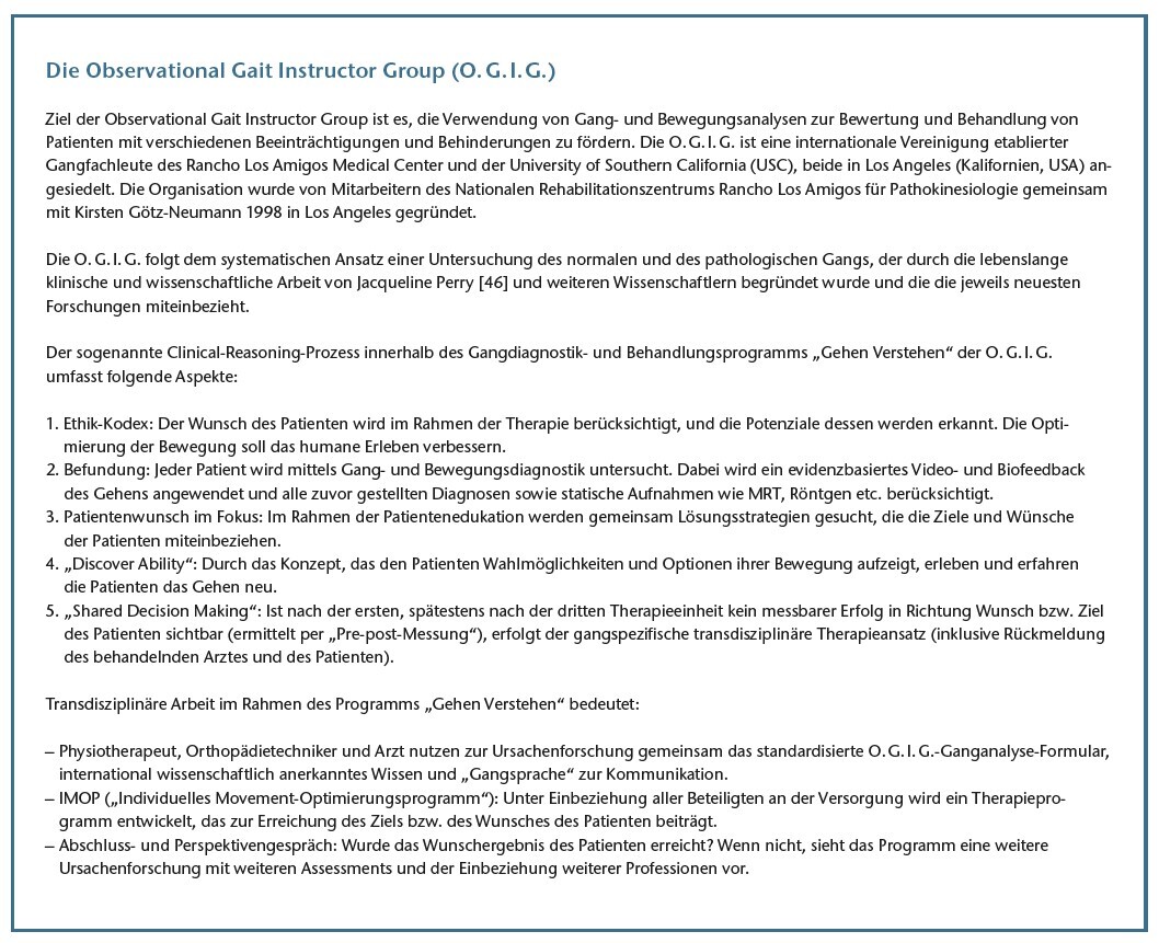 Für Physiotherapeutinnen und ‑therapeuten, die nach den Vorgaben der Observational Gait Instructor Group (O. G. I. G.) 1 arbeiten, sind eine exakte Erfassung des Gangbildes durch Beobachtung, Dokumentation und Analyse sowie eine adäquate Befundung Grundlage der von ihnen vorgenommenen Behandlungen. Diese basieren auf den Vorgaben evidenzbasierten Arbeitens und aktueller wissenschaftlicher Erkenntnisse, um eine optimale und effiziente Behandlung von Patientinnen und Patienten mit einer Gehbehinderung zu gewährleisten. Daraus wird eine sogenannte transdisziplinäre Therapie abgeleitet, um eine signifikante Verbesserung der Lebensqualität des Einzelnen zu erreichen. Der übliche Begriff „Interdisziplinarität“ beschreibt lediglich die Zusammenarbeit verschiedener Disziplinen, bei der die Grenzen zwischen den einzelnen Disziplinen aber nicht aufgehoben werden. Erst mittels „Transdisziplinarität“, so die Überzeugung der Autoren, werden die Perspektiven der Beteiligten substanziell verändert 2 3 4 5: Alle Disziplinen, die an der Versorgung beteiligt sind, stehen untereinander in stetem Austausch. Dabei gelten Patientinnen und Patienten als Hauptakteure des Teams. Nur diese Einbeziehung der Betroffenen gewährleistet, so die Ansicht der Autoren, einen dauerhaften Erfolg der Behandlung 6 7.