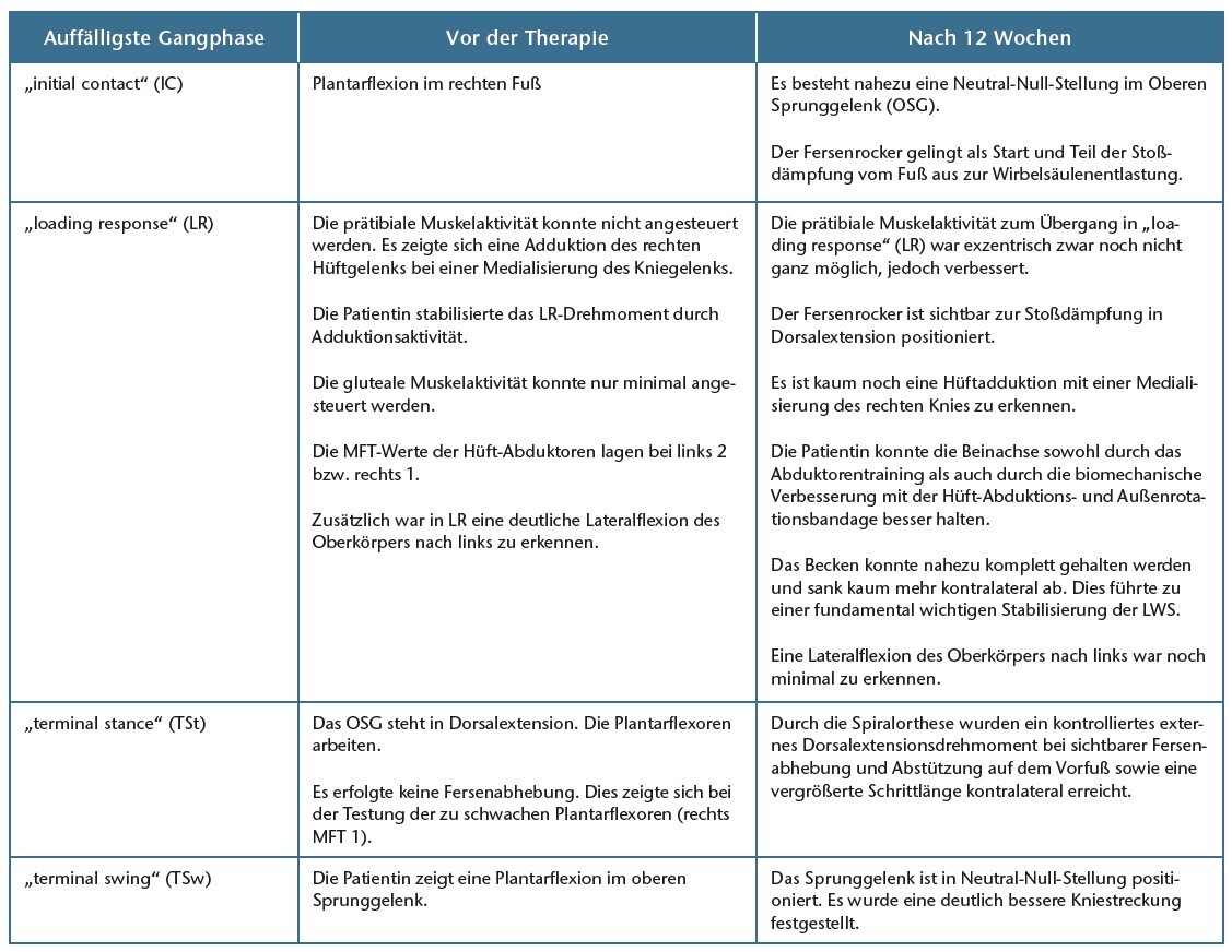 Nach Abschluss der Befunderhebung kristallisierte sich sowohl eine mechanische als auch eine Störung des zentralen Nervensystems 25 26 heraus. Die im Jahr 2014 vorgenommene Versteifung der LWS führte zu einer Dekompression. Zudem bestand seitdem eine Fußheberparese. Zusätzlich wies die Patientin ein Abduktorendefizit der Hüftmuskulatur auf, das zu einem Beckendrop kontralateral führte sowie eine Adduktion im Hüftgelenk verbunden mit einem daraufhin entstehenden medialen Kollaps des Knies ab „loading response“ zur Folge hatte. Die Überdehnung der bereits geschwächten Hüftabduktoren ist dabei biomechanisch unvermeidbar. Gleichzeitig führte die Patientin das Bein ab der „Mid-swing“ bis „Terminal swing“-Phase in einem Crossover. Dadurch fehlt die Stoßdämpfung durch die Beckenstellung für die LWS. In „terminal stance“ erreichte die Patientin keine große Fersenanhebung durch deutlich mangelnde Kraft der Plantarflexoren. Weiterhin konnte die Patientin keine Extension im rechten Hüftgelenk einnehmen, was sie durch eine Hyperlordosierung in der LWS kompensierte. Aus Sicht der Autoren war davon auszugehen, dass sich bei der Patientin aufgrund der Versteifung eine Immobilität in der LWS mit einer Hyperextension in den darüber sowie den darunter liegenden Segmenten herausgebildet hatte. Dies führte zu einer mechanischen Überreizung, was die brennend-dumpfen Schmerzen vor allem bei Belastung wie z. B. beim Gehen ausgelöst hatte (Tab. 1).