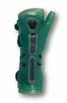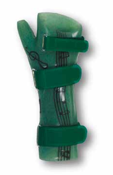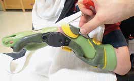 Die Orthesen wurden in geringer Shore-Härte gefertigt, der Abduktionsbereich der Daumen wurde durch eine höhere Shore-Härte ausgeformt, volar wurde eine individuell gefertigte Schiene aus PP herausnehmbar im Silikon verankert. Die Verschlüsse sind über die Unterarmlänge zirkulär umlaufend gefertigt und an der Aufnahme der Verstärkung mit der Orthese verbunden, in der Mittelhand wird der Verschluss ausschließlich dorsal geführt (Abb. 6).
