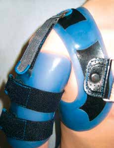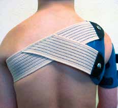 Der zweiteilige Aufbau des Orthesenkonzepts gliedert sich in eine Silikon-Oberarm-Manschette und eine zirkuläre Silikon-Schulterfassung mit Chassis aus FVW oder PP (Abb. 3). Dieses dient als Träger für die Silikonmanschette und als Verankerung für die Gurtführungen. Die Gurte positionieren die passformgetreue Silikonmanschette und gewährleisten mit dem kontralateralen Achselzug die Einstellung des Humeruskopfes im Gelenk (Abb. 4a–c).