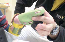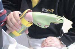 Für einen 10-jährigen Jungen mit Infantiler Cerebralparese 7 8 und Flexions-Kontrakturstellung im Handgelenk (Abb. 9) ergab sich die Frage nach einer Handorthese, die unter Einfassung der Finger inklusive Daumen über eine dynamische Redression das Handgelenk neutral einstellen sollte. Die Versorgung sollte dabei zusätzlich zur Redression auch zur Lagerung verwandt werden. Weiterhin war eine leichte Handhabung der Orthese erwünscht, da die Orthese mehrmals täglich unter anderem zur therapeutischen Behandlung an- und abgelegt werden musste.
