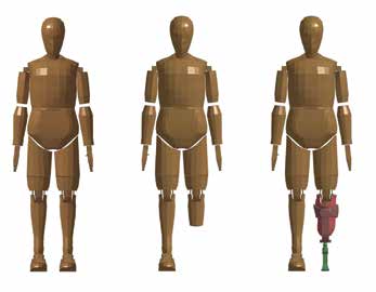 Ein stehender menschlicher 50-Perzentil-Dummy „LSTC Hybrid III” dient in der hier vorgestellten Arbeit als virtuelles Menschmodell (und wird im Folgenden nur als „Dummy” bezeichnet). Dieser Dummy hat kinematisch exakt definierte Gelenke. Größe und Gewicht des Dummys waren 1,70 m beziehungsweise 78 kg. Nachdem Größe und Gewicht von Dummy und Proband beinahe übereinstimmen, wurde keine Skalierung des Dummys vorgenommen. Der Dummy musste an die Anatomie des Probanden angepasst werden und wurde daher an derselben Stelle wie der Proband „amputiert”.
