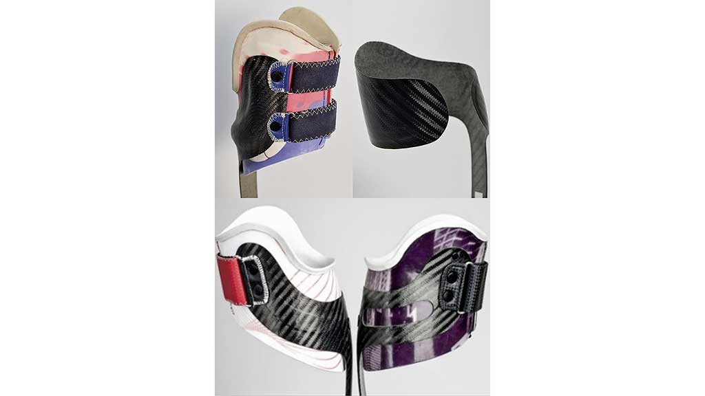 Die oben erwähnte Variation der Prepreg-Feder umfasst nicht nur die Art der Carbonlagen, sondern auch die konstruktive Gestaltung, die aus der plantaren Fußfassung hervorgeht (distaler Verlauf). Sie kann medial, lateral, aber auch medio-lateral gestaltet werden (Abb. 5), wodurch vor allem eine zusätzliche „Längenzugabe“ der Fußkonstruktion vermieden wird. Durch die rein dorsal geführte Carbonfeder kommt es zu einer Längenzunahme der Fußkonstruktion, die dennoch weiterhin mit Konfektionsschuhen versorgbar ist. Die am Markt erhältlichen Carbonfedern (Spring Carbonfeder/Carbon Ankle seven) führen bei Kindern und Jugendlichen häufig zu einer derartigen „Verlängerung“ der Fußfassung, sodass die Schuhgröße deutlich höher gewählt werden muss als ursprünglich notwendig ist. So kann allein durch die Gestaltung der Carbonfeder vermieden werden, dass auf Orthesenschuhe zurückgegriffen werden muss.