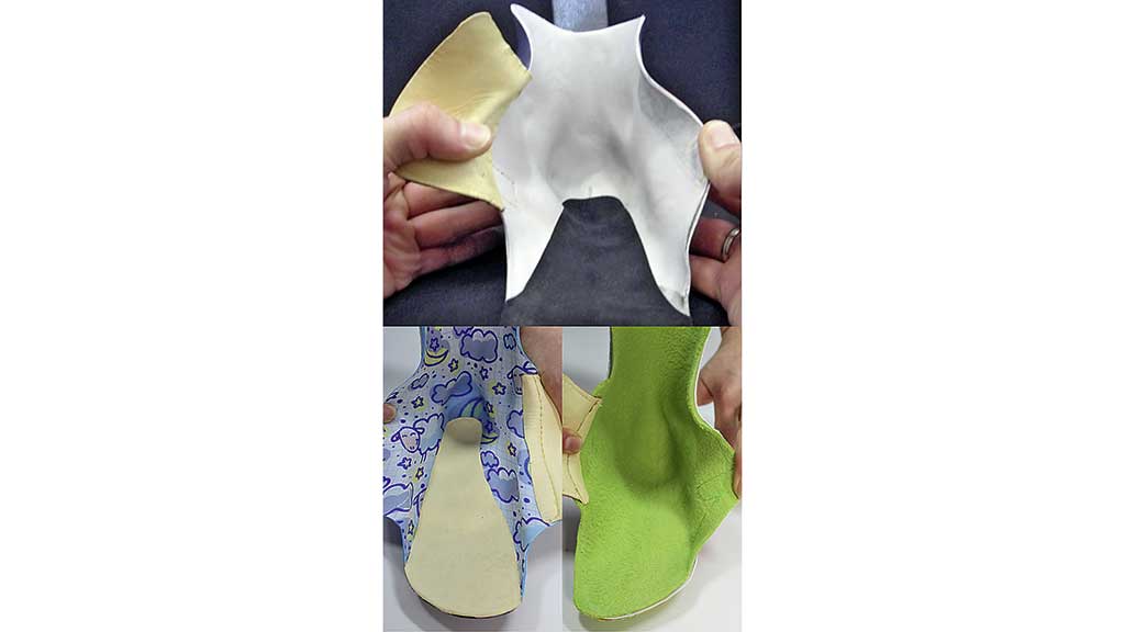 Die Fußfassung selbst kann in verschiedenen Materialausführungen gestaltet werden, wobei in der täglichen Praxis häufig eine Copolymerfassung, eine Streifyflexfassung oder eine Kombination aus Copolymer- und Streifyflex (Co-flex) angewendet wird. Aber auch eine Filz-Leder-Kombination oder die klassische Walklederfußfassung ist unverändert eine Möglichkeit, die vor allem bei einem stark schweißigen Fuß und rigiden Muskeltonus Verwendung findet. Die Fußfassung wird entweder ohne Fütterung, mit Leder, Stoff oder Softshell ausgestattet (Abb. 7), um auch hier eine entsprechend der Hautempfindlichkeit geeignete Lösung für den jeweiligen Befund anbieten zu können.