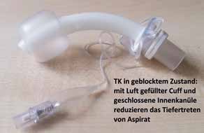 Alle Patienten mit geblockter TK haben ein hohes Risiko für eine Schluckstörung mit meist stiller Aspiration, da sich aufgrund des fehlenden Luftstroms Schluck- und Hustenreflex durch mangelnde Stimulation von Chemo- und Druckrezeptoren der Kehlkopfschleimhaut abschwächen 17. Entscheidend für die Wiedererlangung der Sensibilität in Larynx und Pharynx sowie einer ausreichend hohen Spontanschluckrate ist daher ein Luftstromstimulus. Auch bei stiller Aspiration und vermindertem Hustenstoß sollte daher die TK (wenn zunächst auch nur kurz) entblockt werden, da eine spontane Rückbildung der Sensibilitätsstörung bei dauergeblockter TK nicht zu erwarten ist 18. Selbstverständlich darf dabei nicht leichtsinnig vorgegangen werden; mögliche negative Konsequenzen bei einem zu raschen Trachealkanülenmanagement (z. B. eine Pneumonie) sind jedoch unter engmaschigem Monitoring und multiprofessioneller Teamarbeit vermeidbar.