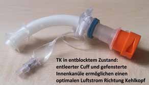 Kann ein Patient nicht von der Beatmung entwöhnt werden, hängt die weitere Therapie von der aktuellen Beatmungssituation ab, d. h., wie invasiv die Beatmung ist und ob Freiatmungsphasen möglich sind. Innerhalb dieser kann geprüft werden, ob eine Entblockung mit Sprechventil möglich ist – zum einen, um verbale Kommunikation zu ermöglichen und die Sensibilität durch physiologische Luftstromlenkung zu verbessern, zum anderen, um eine orale Ernährung diagnostisch abklären und unter weitestgehend physiologischen Bedingungen erfolgen lassen zu können. Ist eine Entblockung nicht möglich, gibt es seit geraumer Zeit eine TK, mit der ein Patient auch unter Beatmung und Blockung phonieren kann, und zwar mittels eines in die Innenkanüle integrierten Sprechventils (Blom® Tracheostomy Tube System von Pulmodyne®). Allerdings ist die Passform der TK (hinsichtlich Länge, Krümmung und Position der Fensterung) nicht für jeden Patienten optimal geeignet.