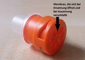 Durch die negativen Auswirkungen der TK auf den Schluckprozess entsteht häufig ein Teufelskreis: Einerseits benötigt der Patient aufgrund seiner reduzierten pharyngo-laryngealen Sensibilität eine geblockte TK, um den Tiefertritt von aspiriertem Material zu vermindern, andererseits führt eine dauergeblockte TK wiederum zu Sensibilitätsstörungen aufgrund des ständigen Speichelreizes auf die umgebende Schleimhaut und den fehlenden physiologischen laryngo-pharyngealen Luftstrom. Therapeuten befinden sich also in einem Dilemma: Zum einen soll der Patient aufgrund von Aspiration möglichst nicht entblockt werden, zum anderen wird sich die Sensibilität ohne physiologische Luftstromlenkung nicht signifikant verbessern 4. Dieser Konflikt ist letztlich nur zu lösen, indem Therapeuten mutig sind und unter (kalkuliertem!) Risiko mit kurzen Entblockungsphasen beginnen, da vor allem eine physiologische Luftstromlenkung durch den Kehlkopf die Sensibilität positiv beeinflusst und zum Anstieg der Schluckfrequenz führt 5. Um den Luftstrom entsprechend zu lenken, kann ein Sprechventil aufgesetzt werden, das als eine Art Rückschlagventil die Ausatmungsluft in Richtung Larynx lenkt (Abb. 1). Durch dieses entsteht ein ausreichend hoher subglottischer Druck, der eine Schlüsselkomponente des effektiven Schluckaktes ist. Zahlreiche Studien zeigen, dass der Aufsatz eines Sprechventils eine sofortige positive Wirkung auf die Biomechanik des Schluckprozesses hat und dass hierdurch schrittweise das Aspirationsausmaß verringert werden kann 67.