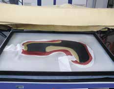 Sodann wird ein Vakuum zwischen Modell und Silikonmatten incl. Laminat angelegt. Dies sollte behutsam erfolgen, um den Fasern die Möglichkeit zu geben, sich dreidimensional auszurichten. Durch die Dehnung der Silikonmatte wird dabei dem Gedanken, die Fasern unter Zug zu setzen, Rechnung getragen. Nach der Abkühlphase kann das Bauteil aus dem Fertigungsaufbau entnommen werden. Eine Maximalbelastung des Bauteiles sollte erst nach einigen Stunden erfolgen, nachdem die Matrix ihre teilkristalline Struktur wiederhergestellt hat.