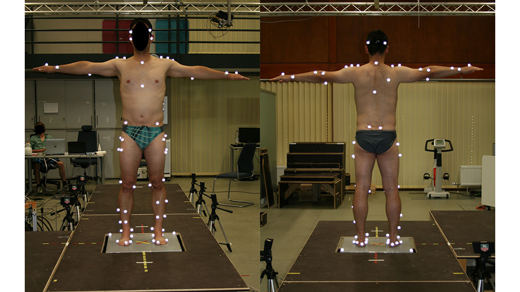 Die kinematischen Daten wurden mit einem Infrarot-Kamera-System (10 Kameras, 200 Hz, Vicon Motion Systems, Oxford Metrics Group, Oxford, United Kingdom) erfasst. Dazu wurden 42 reflektierende Marker an den für das Mehrkörpermodell relevanten anatomischen Körperpunkten am Probanden angebracht (Abb. 2). Zusätzlich wurden 22 anthropometrische Parameter erfasst 37 38. Zur Berechnung der kinematischen Parameter wurde das Mehrkörpermodell „alaska/Dynamicus“ 39 genutzt.