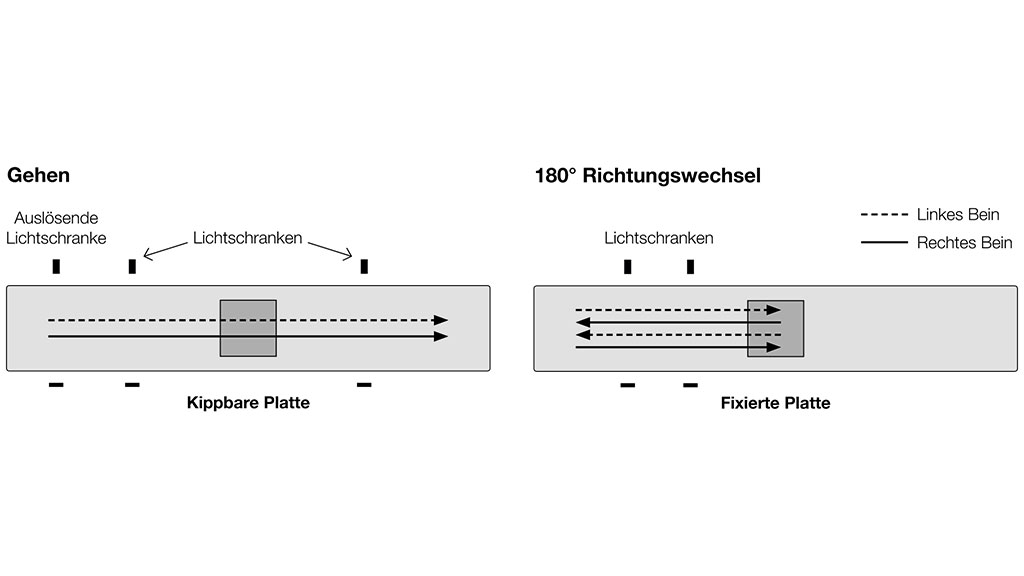 Beim Gehen liefen die Probanden mit einer vorgegebenen Geschwindigkeit von 5 km/h (± 5 %) über eine nach rechts oder links kippbare Platte (Abb. 1), um eine Störung in medialer oder lateraler Richtung zu provozieren. Vorgabe war, die Platte jeweils mit dem verletzten Bein zu treffen. Dabei wurde der Zeitpunkt der Kippung über Lichtschranken kontrolliert und so gewählt, dass die Platte entweder bereits vor dem Schritt auf die Platte in endgradiger Position (9°) gekippt war (prädiktive Situation) oder erst während des Schrittes auf der Platte kippte (reaktive Situation). Alle Experimentalbedingungen (Kippung medial oder lateral, vor oder während des Schrittes) wurden innerhalb der drei Orthesenbedingungen (Ohne, Hartrahmen, Soft) randomisiert, sodass die Probanden vor Bewegungsbeginn nicht wussten, welche Bewegung als Nächstes folgte.