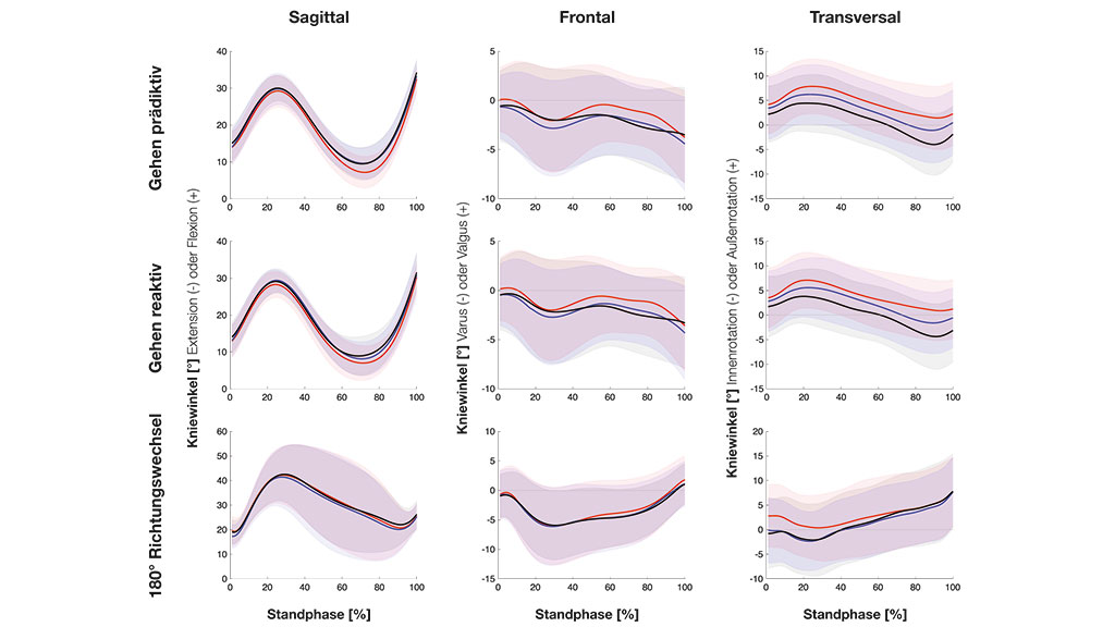 Abbildung 3 zeigt die Kniewinkelverläufe in allen drei Ebenen für alle drei Bewegungsaufgaben während der Standphase. Die Mittelwerte der Kniegelenkwinkel sind in den Tabellen 1 bis 3 dargestellt.