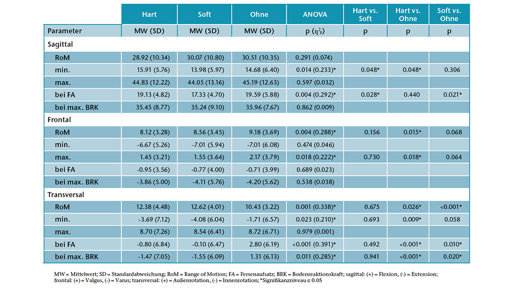 Um den Effekt der Orthesen (Ohne, Hart, Soft) auf die Kniewinkel zu untersuchen, wurde für jede Bewegung (Gehen prädiktiv, Gehen reaktiv, Richtungswechsel) eine einfaktorielle Varianzanalyse mit Messwiederholung durchgeführt. Für die Post-hoc-Vergleiche wurde die Holm-Bonferroni-Korrektur angewandt. Als Effektstärke wurde das partielle Eta-Quadrat (kleiner Effekt: ƞ p2 = 0,01; mittlerer Effekt: ƞ p2 = 0,06; großer Effekt: ƞ p2 = 0,14) 41 42 angegeben; das Signifikanzniveau für alle statistischen Tests lag bei 0,05.