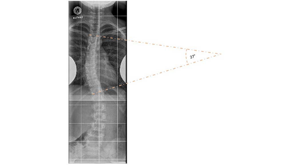 Nach sorgfältiger klinischer Untersuchung sollten im Rahmen der Primärdiagnostik Wirbelsäulenganzaufnahmen in zwei Ebenen im Stehen angefertigt werden. Wenn für die Therapieplanung relevant, kann die Aufnahme in der Frontalebene ebenfalls die Beckenkämme mit ablichten, um hieraus Rückschlüsse auf das Skelettalter zu bekommen. Dabei beschreibt das sogenannte Risser-Stadium den Status der Beckenkammapophyse in Bezug auf ihre Verknöcherung. Das Ausmaß der Skoliose wird über die Winkelmessung nach Cobb bestimmt. Dabei werden die beiden am stärksten verkippten Wirbel oberhalb und unterhalb eines Wirbelsäulenbogens als Neutralwirbel bestimmt. Der Winkel zwischen den beiden Neutralwirbeln wird über Tangenten gemessen (Abb. 1). Die Rotationskomponente wird nach Nash und Moe entsprechend der Position der Bogenwurzeln in der Darstellung des Wirbelkörpers bestimmt.