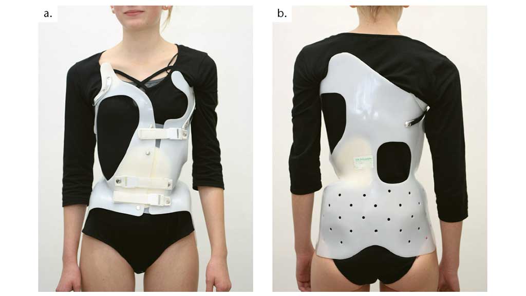 Als Korsett bei idiopathischer Skoliose hat sich am besten die sogenannte Chêneau-Orthese (Abb. 2a u. b) etabliert, ein maßgefertigtes aktives Derotationskorsett, das 1978 von Jacques Chêneau zur Therapie von Skoliosen eingeführt wurde. Es handelt sich dabei um ein Thorako-lumbo-sakral-Korsett, das 23 Stunden pro Tag getragen werden soll. So besteht das Prinzip dieser Orthese in der Schaffung einer stabilen Basis am Beckenkamm sowie am kranialen Ende der Krümmung mit einer entsprechenden Anlage im Apexbereich der Hauptkrümmung und der Schaffung von Freiräumen auf der kontralateralen Seite.