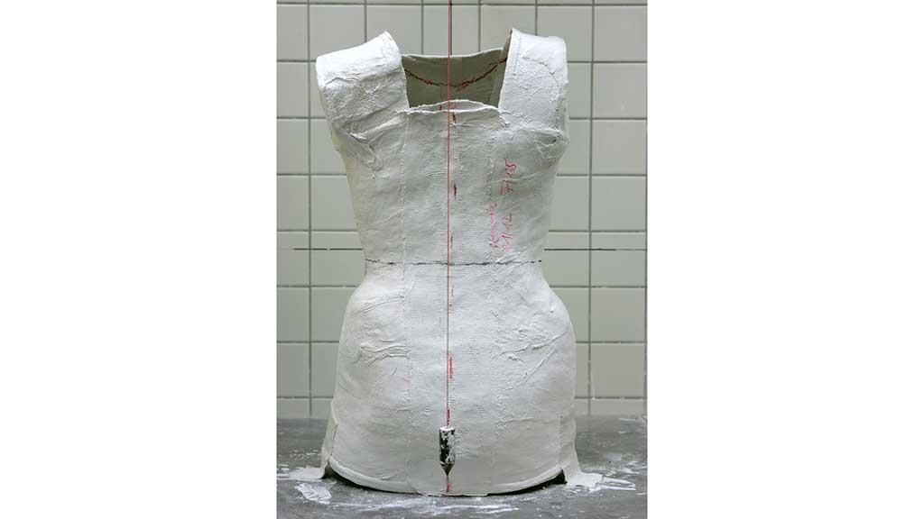 Nach dem Ausgießen wird das Gipspositiv unter Betrachtung des Röntgenbildes und der ermittelten Körpermaße in eine korrigierte Zweckform modelliert (Abb. 3a–c). In die modellierten Druckzonen „lumbal“, „thorakal“ und „axial“ wird ein festes Polstermaterial („Multisoft“) eingebracht und in einem auslaufenden Kantenverlauf geschliffen. Anschließend wird die Orthese aus Polyethylen (Temperatur bei ca. 180 °C) mittels Unterdrucks tiefgezogen und erkaltet anschließend zur Formstabilität für ca. 24 Stunden. Nach dem Erkalten wird die Orthese mittels oszillierender Säge vom Gips getrennt, in die gewünschte Form geschliffen, Kanten geglättet, Korrekturpelotten eingeklebt und mit Probegurten versehen.