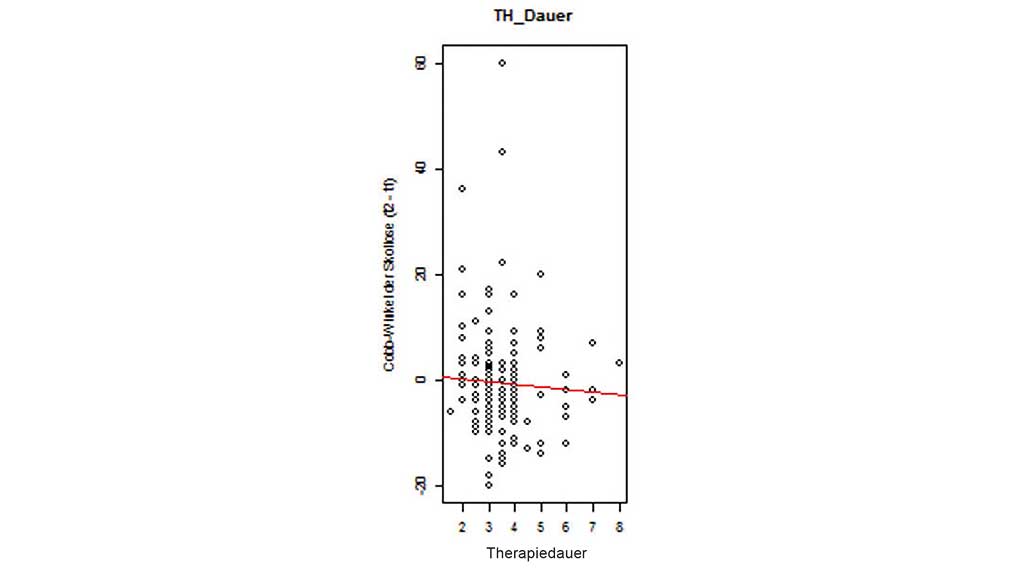 Der durchschnittliche Cobb-Winkel vor der Behandlung betrug 28,39° ± 9,44°; zum Abschluss der Behandlung lag er bei 27,70° ± 12,34°. Eine Stabilisierung des Cobb-Winkels mit einer Progredienz von ≤ 5° wurde bei 136 (85,5 %) der insgesamt 159 Patienten erzielt. Lediglich bei 23 Patienten aus dem Kollektiv kam es zu einer Progredienz des Cobb-Winkels von mehr als 5°; davon mussten sich 19 Patienten einer Operation unterziehen. Eine Verbesserung des Cobb-Winkels konnte mit einer Abnahme um ≥ 6° bei Abschluss der Behandlung bei 42 Patienten dokumentiert werden (25,4 %). Aus dieser Gruppe wiederum wurde bei 9 Patienten sogar eine Verbesserung des Cobb-Winkels um ≥ 10° erzielt (5,6 % des Gesamtkollektivs).