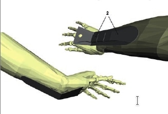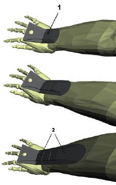 Um die größtmögliche Stabilisierung zu erreichen, ist eine feste Fixierung der Schiene an der Hand sinnvoll. Die längeren Varianten wurden im Modell zusätzlich mit zwei modellierten Klettverschlussringen an den Unterarm angebunden, wie dies auch bei handelsüblichen Orthesen der Fall ist.