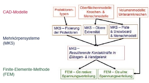 Die Analyse biomechanischer Fragestellungen ist mit verschiedenen Werkzeugen aus dem Bereich des Computer Aided Engineering (CAE) möglich. Zu den Simulationswerkzeugen zählen Programmpakete zum Aufbau von Mehrkörpersystemen (MKS), des Computer Aided Design (CAD) und der Finite-Elemente-Methode (FEM). Abbildung 4 zeigt die Struktur der Computermodelle der unterschied lichen CAE-Werkzeuge und ‑Methoden, die zur Analyse der Verletzungsszenarien verwendet wurden.