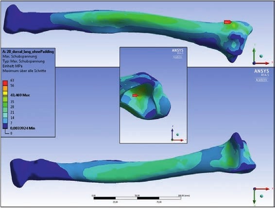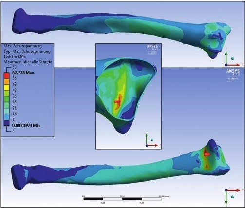 Wie eingangs erwähnt wurden die unterschiedlichen Konzepte zur Schienung jedoch nicht nur beruhend auf den MKS-Modellen analysiert. Die Ergebnisse der Mehrkörpersysteme-Simulation wurden zusätzlich in ein detailliertes FE-Knochenmodell des Radius eingeleitet. Anschließend erfolgte eine Beurteilung der unterschiedlichen Varianten anhand des jeweils auftretenden Belastungszustands.