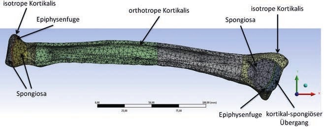 Zur Berechnung der Belastungsspitzen und ‑lokalisationen im Radiusknochen wurden die in den MKS-Simulationen berechneten Kraftverläufe im Handgelenk am Radiusknochen in das mit der Software Ansys R14.5 (Ansys Inc., Canonsburg, USA) erstellte Finite-Elemente-Modell eingeleitet. Eine Zusammensetzung der detaillierten CAD-Knochenmodelle erfolgt in der FE-Software durch die Definition von Kontaktbedingungen, welche den Körper als festen Verbund einzelner Teile charakterisieren. Anschließend wird den jeweiligen Knochenbestandteilen ein Parameter-Set der Werkstoffdaten zugewiesen. Die Materialeigenschaften wurden aus der Literatur entnommen 12 13. Im Knocheninneren schließen an den Enden spongiöse Bereiche der Metaphyse an, welche aus hyalinem Knorpel besteht. Umgeben wird der gesamte Knochen von anteilig orthotrop und isotrop modellierter Kortikalis (Abb. 8). Da Versuchsdaten in der Biomechanik aufgrund der großen Vielfalt von Materialdaten im menschlichen Gewebe nur schlecht übertragbar sind, wurde das erstellte Modell bezüglich seines Steifigkeitsverhaltens anhand von Daten experimenteller Druckversuche an Radiusknochen von Varga et al. 14 validiert.