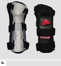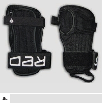 Während im Sport versucht wird, den distalen Unterarm präventiv mit Protektoren zu schützen, werden bei der Behandlung bereits vorhandener Verletzungen zur Ruhigstellung Handgelenksorthesen eingesetzt. Der Indikation entsprechend werden dabei hohe Anforderungen an die Stabilisierung des distalen Unterarms gesetzt. Die am Markt befindlichen Protektoren- und Orthesenkonzepte sind in ihrem Aufbau ähnlich, dies betrifft auch die Art der Schienung (palmar, dorsal sowie kurz, lang) (Abb. 2, 3). Eine Übertragbarkeit der Ergebnisse zur Evaluierung der Funktionalität von Orthesen wäre somit gegeben und erscheint sinnvoll.