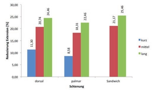 Während bei der kurzen Schienung die Verringerung bestenfalls 11,3 % beträgt (dorsale Variante), erreicht die dorsale lange Variante ein Maximum von 24,5 %. Auch eine palmare Schienung verringert die maximale Dorsalflexion des Handgelenks, jedoch in geringerem Maße als eine dorsale Schienung. Die Verwendung einer beidseitigen Schienung zeigt nur einen sehr geringen zusätzlichen Nutzen im Vergleich zur rein dorsalen Variante.