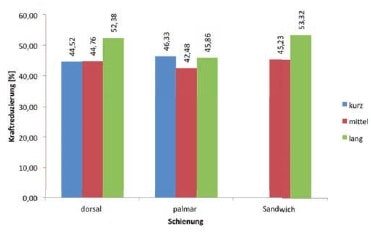 Insgesamt klar herauszustellen ist die verminderte Wirksamkeit der kurzen Modelle. In Bezug auf die Gelenkkraft stellt die kurze Variante einer palmaren Schienung zwar sogar das beste Konzept dar; auch bei dorsaler Schienung ist der Unterschied zwischen kurzer und mittlerer Variante minimal. Dennoch erreichen bei zusätzlicher Betrachtung des Extensionswinkels des Handgelenks die längeren Varianten deutlich bessere Ergebnisse. Daher wurde auf die Modellierung einer kurzen Sandwichvariante verzichtet.