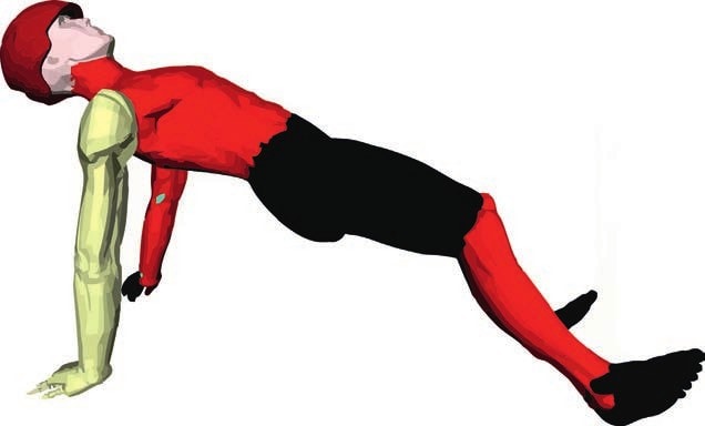 Zur Berechnung der auftretenden Belastungen im Radiusknochen und einer daraus resultierenden Beurteilung der Wirksamkeit unterschiedlicher Schienungskonzepte wurde mit dem Mehrkörpersimulationsprogramm Simpack V9.3 (Simpack AG, Gilching) ein Modell eines 20-jährigen Mannes erstellt (Abb. 5). Das MKS-Modell beinhaltet ein detailliertes Modell der oberen rechten Extremität mit auf CT-Daten basierenden Knochenmodellen und validierten Kraftelementen der Weichteilstrukturen 6. Die Validierung des Modells erfolgte anhand experimenteller Bewegungsanalysedaten 7 und der Berechnung der Bodenreaktionskräfte 8. Die anthropometrischen Daten entsprechen dem männlichen 50. Perzentil, entnommen aus der aktuellen Size-Germany-Reihenmessung.