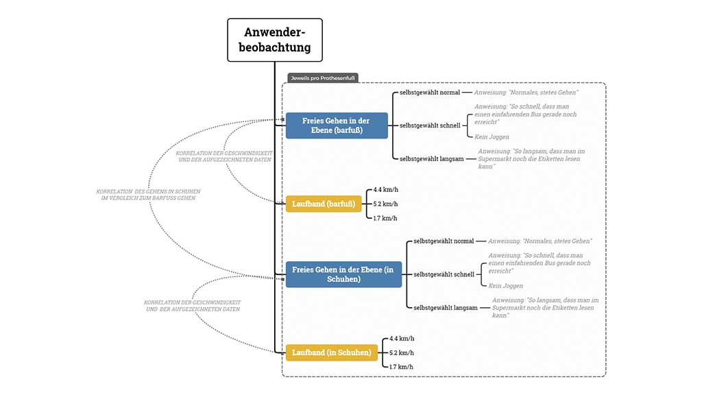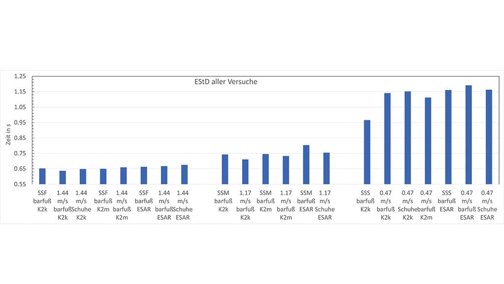 Die Messungen wurden zunächst ohne Schuhe, im Anschluss mit Schuhen (Modell „Apex“, Viking, Oslo, Norwegen) durchgeführt. Nach der Messung des freien Gehens im Bewegungslabor mit dem jeweiligen Prothesenfuß (15 m gerade Strecke) wurden die Untersuchungen auf einem Laufband wiederholt. Dabei wurden mit dem ESAR-Fuß die folgenden Gehgeschwindigkeiten festgelegt:
