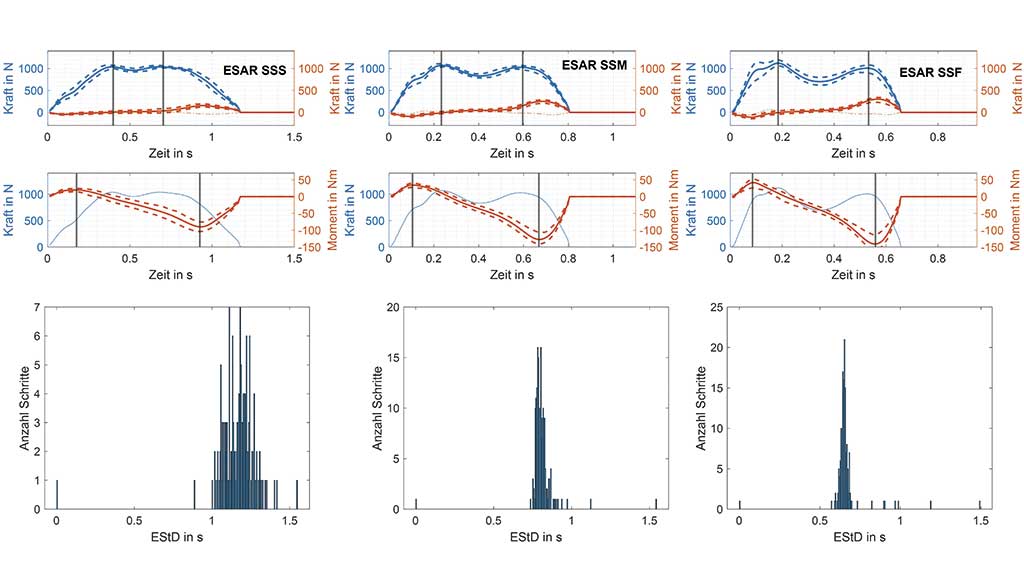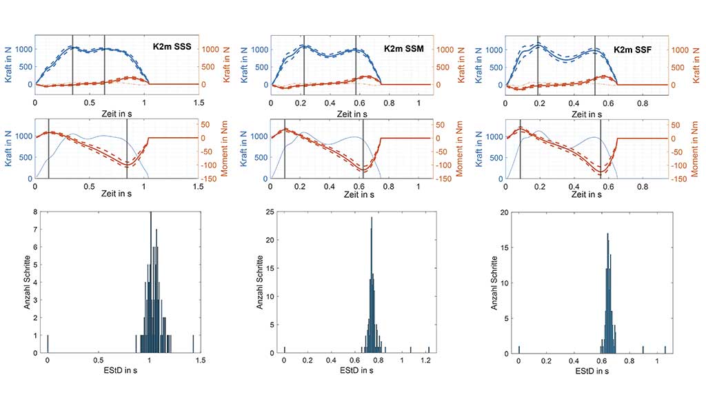 Die Histogramme der Messdaten des K2m-Fußes (Abb. 9) zeigen eine geringe Varianz der EStD beim mittleren und schnellen Gehen sowie eine Zunahme der anterioren/posterioren Kräfte bei höheren Gehgeschwindigkeiten.