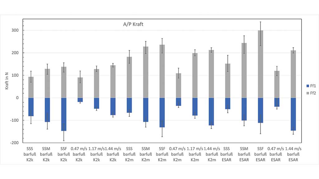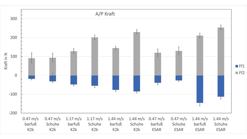 Bei den anterioren/posterioren Kräften (Abb. 12) kann beobachtet werden, dass eine reduzierte bremsende Kraft (Ff1) auf dem Laufband bei allen Füßen (- 22 % bis — 77 %) im Vergleich zum freien Gehen vorliegt. Dieser Effekt verstärkt sich mit abnehmender Gehgeschwindigkeit. Für den ESAR-Fuß kann beobachtet werden, dass für die Geschwindigkeiten SSS, SSM und SSF im Vergleich zum K2m-Fuß für die hohe Geschwindigkeit die Ff2-Kraft abnimmt (+ 20 %, — 7 % und — 21 %). Im Vergleich zum K2k-Fuß fällt in allen Geschwindigkeitsbereichen eine Reduktion der Ff2-Kraft auf (- 38 %, — 47 % und — 54 %). Zudem zeigt sich keine relative Zunahme der Kraft Ff2 beim K2m-Fuß von SSM zu SSF. Dies wurde auch in den Anwenderkommentaren geäußert, wonach der K2m-Fuß zwar sehr komfortabel beim langsamen Gehen sei, jedoch für hohe Geschwindigkeiten zu weich erscheine.