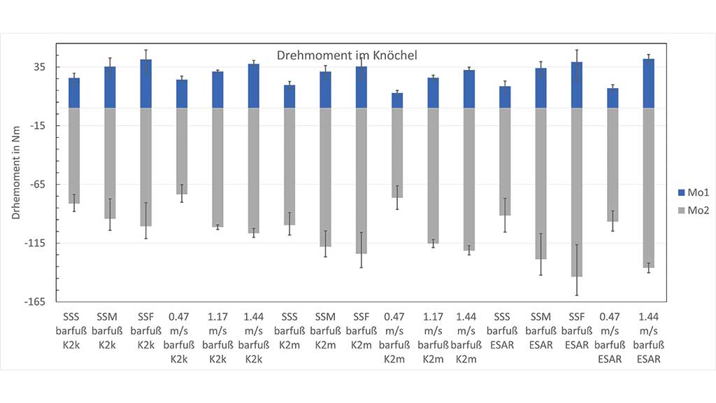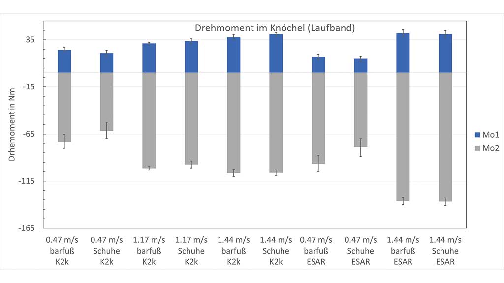 Beim Knöchelmoment ist ein ähnlicher Effekt beim Gehen auf dem Laufband gegenüber dem freien Gehen zu beobachten: Das Drehmoment auf dem Laufband fällt bei langsameren Geschwindigkeiten grundsätzlich geringer aus und nähert sich im Mittelwert bei mittleren und hohen Gehgeschwindigkeiten dem freien Gehen an (Abb. 13).