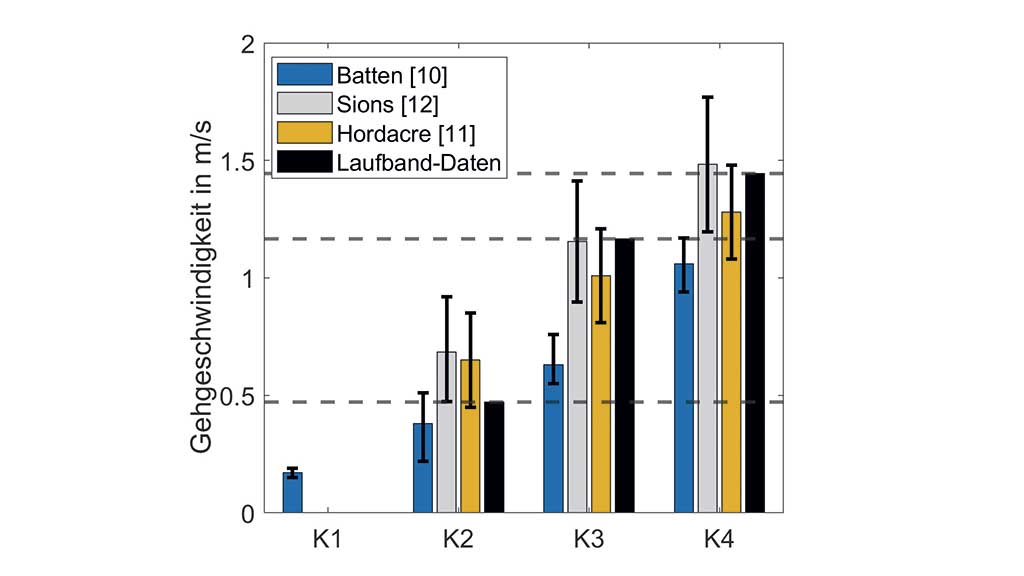 Die Gesamtdauer der Einzelversuche variierte zwischen 3 und 5 Minuten Gehzeit. Aus den Laufbandversuchen kann unmittelbar die Gehgeschwindigkeit ausgelesen und mit den Daten aus der Literatur 20 21 22 23 verglichen werden, die den Aktivitäts- bzw. Mobilitätsgrad mit der durchschnittlichen Gehgeschwindigkeit korrelieren (Abb. 4). Dabei repräsentiert die selektierte Geschwindigkeit „langsam“ (0.47 m/s) die durchschnittliche Gehgeschwindigkeit von K2-Nutzern gut und liegt im Durchschnitt der Studien. Für einen durchschnittlichen K3- und K4-Nutzer liegen die ausgewählten Gehgeschwindigkeiten „mittel“ (1.17 m/s) und „schnell“ (1.44 m/s) im oberen Bereich der Geschwindigkeitsskala, jedoch gleichauf mit dem Mittelwert aus 24. Die Vergleichbarkeit der Gehgeschwindigkeiten auf dem Laufband und aus den Versuchen beim freien Gehen wurde wiederum über die EStD-Dauer und deren Abweichung hergestellt.