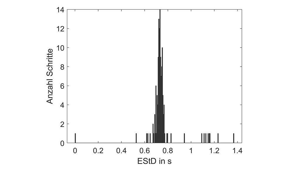 Die KMS-Daten konnten bis auf einen Datensatz (ESAR, Laufband, 1.17 m/s) ausgewertet werden. Im Histogramm (Abb. 5) sind beispielhaft die EStD dargestellt. Diese werden wiederum nach dem Maximum und dessen Verteilung bewertet. Die Einzelschritte, die dem Mittelwert und der Varianz der EStD entsprechen, wurden auf 100 % der Standphasen normalisiert und von den KMS-Daten der jeweilige Mittelwert sowie die Perzentile (+/- 90%) berechnet (Abb. 6). Bei einer Messdauer von mehr als 3 Minuten pro Messung ergeben sich somit zwischen 100 und 350 repräsentative Einzelschritte. Somit können z. B. Hinweise auf die Variabilität des Gangbildes gewonnen werden. Im Folgenden wurde die Korrelation der EStD zwischen dem Gehen auf dem Laufband sowie dem freien Gehen untersucht (Abb. 7). Die Auswertung zeigt eine sehr gute Korrelation der EStD zwischen dem Gehen auf dem Laufband und dem freien Gehen mit schneller (0.66 s +/- 0.01) und mittlerer Geschwindigkeit (0.75 s +/- 0.03). Beim Gehen mit langsamer Geschwindigkeit (1.17 s +/- 0.07) konnte unabhängig vom Prothesenfuß eine um bis zu 0.2 s schnellere EStD beim freien Gehen beobachtet werden. Dies lässt sich vermutlich mit der ineffizienten, langsamen Gehgeschwindigkeit auf dem Laufband begründen 25. Die Abweichung der Messdaten zur EStD auf dem Laufband und mit dem KMS liegt bei +/- 3 %.