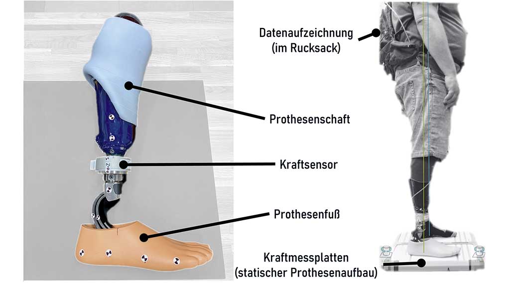 Für die Studie wurden Messungen mit einem aktiven Prothesenträger durchgeführt (transtibiale Amputation nach Trauma, Amputationszeit > 10 Jahre, Gewicht ca. 105 kg, Alter 55 Jahre, Mobilitätsgrad K3 17). Die Messungen wurden im Verlauf mehrerer Einzelmesstage mittels eines leichten (180 g, 36 mm Gesamtaufbauhöhe) in den Prothesenaufbau integrierten speziell angefertigten Kraft- und Momentensensors (Sensix, Poitiers, Frankreich) vorgenommen. Die Untersuchungen fanden im Rahmen herstellerspezifischer Studien statt und sind durch ein Ethikprotokoll der isländischen Arzneimittelbehörde „Lyfjastofnun“ (Icelandic Medicines Agency, IMA) abgedeckt. Sie wurden in einem Bewegungslabor in Island durchgeführt.