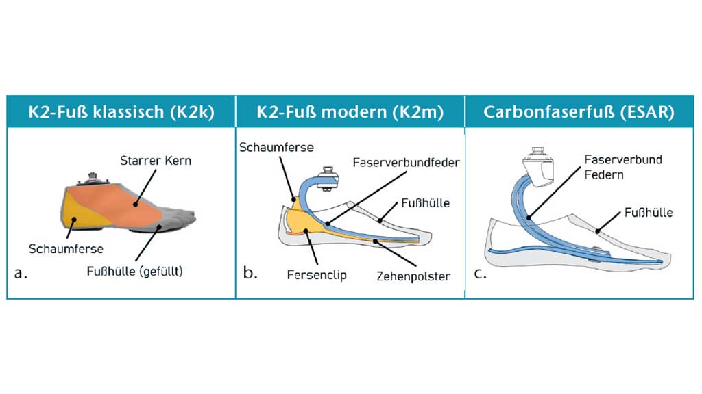Der Prothesenaufbau wurde von einem Orthopädietechniker mit einem Messsystem („3D L.A.S.A.R.“, Ottobock, Duderstadt, Deutschland) richtliniengetreu sichergestellt. In Abbildung 1 ist die Prothese mit dem verwendeten Kraft- und Momentensensor (kurz KMS) dargestellt, der in allen Aufbauvarianten direkt über dem Prothesenfuß mittels Prothesenaufnahmen angebracht ist. Die Datenaufzeichnung („DataQ DI-710“, 600 Hz) befindet sich in einem leichten Rucksack und ist per Kabel mit dem KMS verbunden. Die Genauigkeit des Messsystems wurde gegenüber einem weiteren KMS-System, integriert in einen maschinellen Gangsimulator 18, überprüft. Die für die Studie verwendeten Prothesenfüße werden in Tabelle 1 spezifiziert. Eine detaillierte Beschreibung des Aufbaus ist in den Abbildungen 2a–c dargestellt. Die gewählten Prothesenfüße decken ein breites Produktspektrum ab: von einem sehr einfachen Fuß („K2k“) über eine optimierte Abwandlung davon („K2m“) bis zu einem flexiblen Carbonfaserfuß („ESAR“).