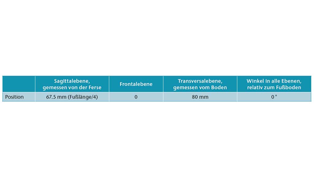 Die Auswertung der vorliegenden Rohdaten wurde mittels selbst entwickelter Algorithmen („Matlab“, MathWorks, Natick, MA, USA) durchgeführt. Jeder Einzeldatensatz wurde zunächst aufbereitet (Übersprechen und Tara der Einzelkanäle) sowie eine Filterung (Butterworth, 50 Hz Tiefpass, 5. Ordnung) durchgeführt und in Einzelschritte aufgespalten. Die Bodenkontaktzeit, hier als „Einzelschrittstandphasendauer“ (kurz EStD) bezeichnet, wurde wiederum statistisch bewertet. Hieraus kann ein statistisches Maximum aller EStD sowie die Varianz davon abgeleitet werden. Als Bandbreite der Abweichung vom jeweiligen zeitlichen Maximum jeder Messung wurde ein Fenster von +/- 0.2 s gewählt. Somit konnten im Gesamtdatensatz abweichende schnelle bzw. langsame Schritte (z. B. Stehen) einfach herausgefiltert werden. Zum Vergleich der Prothesenfüße wurde für die Kraft- und Momentendaten ein Drehzentrum des Knöchelgelenks als Ursprung des Koordinatensystems angenommen 19 und die KMS-Daten virtuell dorthin verschoben (3D-Translation und ‑Rotation) (Tab. 2).