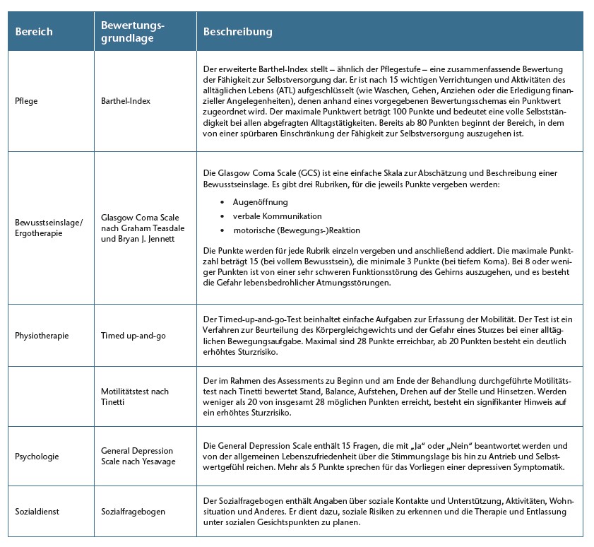 Tabelle 1 vermittelt einen Überblick über die Möglichkeiten einer Bewertungsgrundlage für die Indikation. Sind Rehabilitationsvoraussetzungen und Indikation gegeben, beginnt das Frührehabilitationsprogramm nach der Therapeutenkonferenz.
