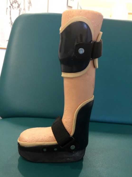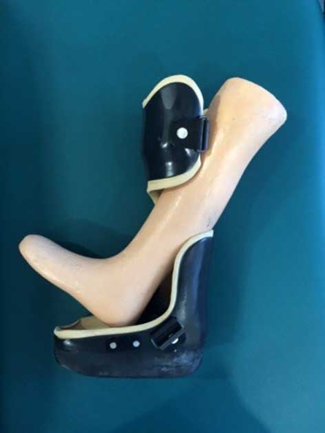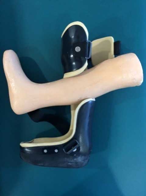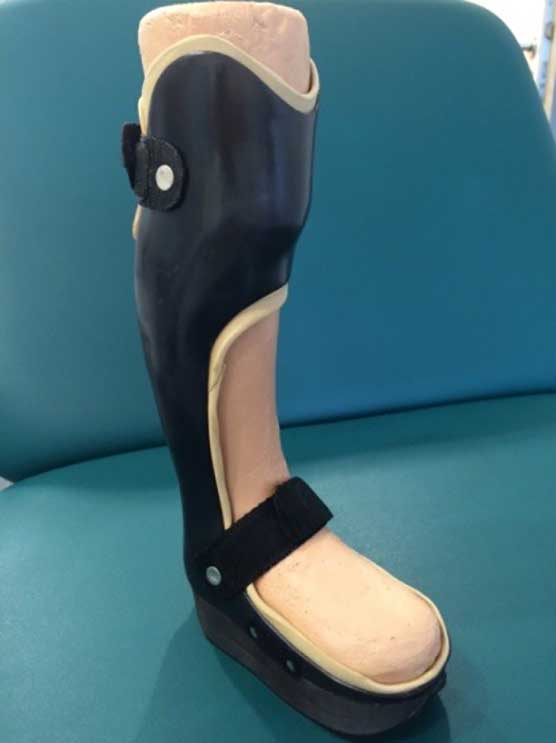 Besonders bei Patienten mit einer Diabetischen Neuropathischen Osteoarthropathie (kurz DNOAP), allgemein auch als “Charcot-Fuß” bekannt, ist es ein priorisiertes Ziel, die Patienten aktiv zu mobilisieren. Es gilt zu gewährleisten, dass sich die Patientin bzw. der Patient selbstständig fortbewegen kann und nicht zwingend auf einen Rollstuhl angewiesen ist. Die Mobilisierung erfolgt unter Berücksichtigung leidensgerechter Aspekte (Schweregrad der Krankheit, körperliche Verfassung usw.) und ist bei DNOAP-Erkrankungen besonders wichtig. Denn das Ziel der Mobilisierung steht bei Patienten mit einer solchen Erkrankung vorerst in einem Konflikt, da die Füße nicht selten starke Deformitäten und Entzündungen aufweisen. Als Konsequenz ist ein selbstständiges Gehen ohne Unterstützung nicht zielführend und hinsichtlich des Krankheitsverlaufs kontraproduktiv. Für den Fall, dass Deformitäten oder Fußfehlstellungen zu stark ausgeprägt sind, ist ein operativer Eingriff mit dem Ziel einer biomechanisch korrekten Reposition vorab zwingend erforderlich. In jedem Fall besteht die Notwendigkeit, ein medizinisch-technisches Hilfsmittel zur Mobilisierung mit einzubeziehen, um langfristig den Erhalt bzw. die Wiederherstellung der Erwerbsfähigkeit und eine Senkung der Pflegebedürftigkeit zu erreichen. In diesem Zusammenhang hat sich bislang der Einsatz einer patientenspezifischen Unterschenkelentlastungsorthese aus carbonfaserverstärktem Kunststoff im Versorgungsalltag bewährt (Abb. 3), die von einem Orthopädietechniker hergestellt wird.
