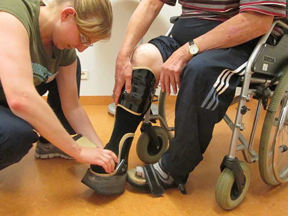 - Hilfsmittelversorgung und ‑training wie z. B. Rollstuhltraining oder Training im Umgang mit der Orthese (Abb. 2),