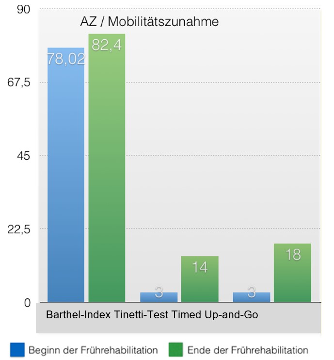 In Abbildung 4 ist exemplarisch dargestellt, welche Verbesserungen hinsichtlich des Allgemeinzustandes oder der Mobilität bei den 158 behandelten Patienten aus den Jahren 2014/2015 durch den vorgestellten kombinierten Ansatz erlangt werden konnten. Durch eine leidensgerechte Hilfsmittelversorgung wie die vorgestellte Orthesenversorgung konnte der Tinetti-Test von durchschnittlich 3 auf 14 Punkte verbessert werden, der Timed up-and-go-Test sogar von 3 auf 18 Punkte. Bezüglich der Bewertung anhand des Barthel-Index zur Fähigkeit einer Selbstversorgung konnte mit einer Verbesserung von durchschnittlich 78,02 auf 82,4 Punkte die 80-Punkte-Grenze überschritten werden. Der Weg einer Verbesserung von einer spürbaren Einschränkung der Fähigkeit zur Selbstversorgung hin zu voller Selbstständigkeit ist somit geebnet worden. Das bestmöglich anzustrebende Ergebnis nach Abschluss des vorgestellten Frührehabilitationsprogramms ist eine Anschlussheilbehandlung zur Verhinderung einer Pflegebedürftigkeit, einer Erwerbsunfähigkeit und die Umsetzung von Teilhabe am Arbeitsleben.