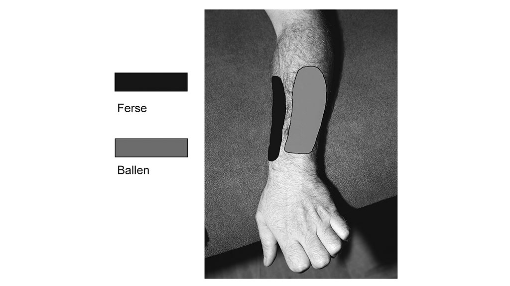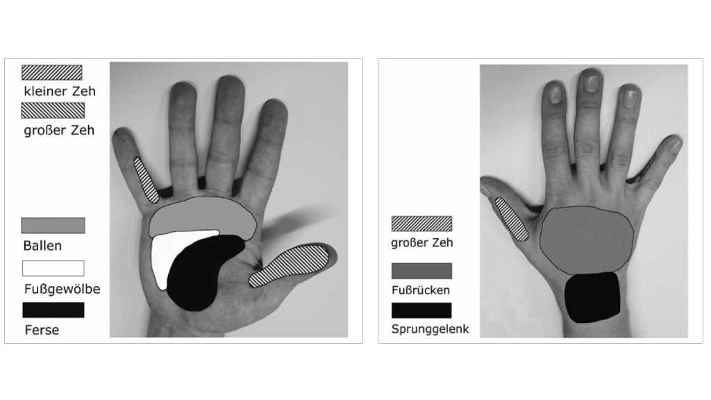Mithilfe eines Aquarellpinsels wurde die Innen- und Außenseite der rechten Hand und des Unterarmes des Probanden überstrichen. Auf diese Weise ließen sich mehrere rezeptive Felder abgrenzen, von denen Phantomempfindungen bestimmter Teile seines verlorenen Fußes auszulösen waren. Ihre Grenzen wurden mithilfe eines Fettstifts auf die entsprechenden Hautzonen gezeichnet. In digitalen Aufnahmen ließen sich diese Felder mithilfe einer Photoshop-Funktion anhand unterschiedlicher Schraffuren und Grautöne hervorheben (Abb. 1). In der Handinnenfläche fand sich ein rezeptives Feld für den rechten Ballen und die rechte Ferse. Taktile Reize zwischen diesen beiden Feldern lösten Empfindungen eines rechten Fußgewölbes aus. An Daumen und kleinem Finger fand sich je ein rezeptives Feld für die große und kleine Zehe. Die Außenseite der Hand wies drei rezeptive Felder für Sprunggelenk, Fußrücken und großen Zeh auf.