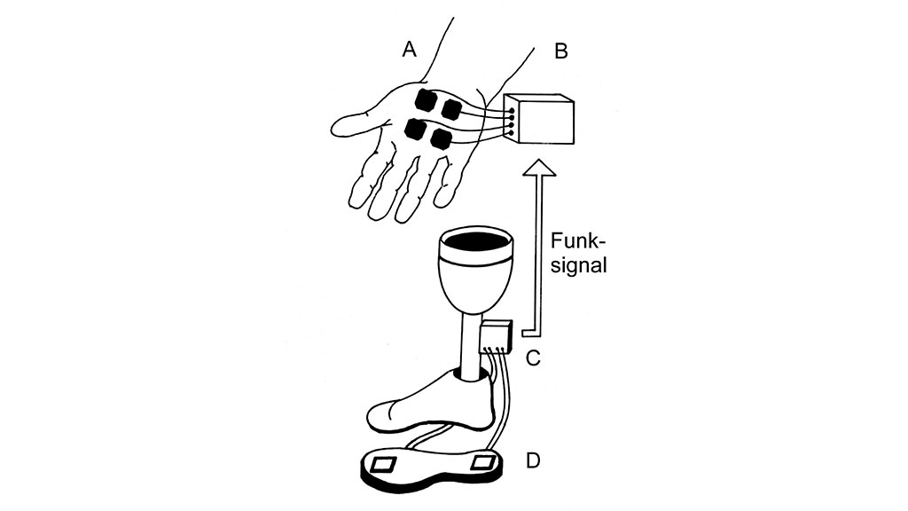 Die Verbindungskabel zwischen den Drucksensoren der Schuhsohle und dem Impulsgenerator konnten durch das Hosenbein geführt werden, doch wurde diese Verkabelung als störend empfunden. Daher wurden die von den Drucksensoren ausgehenden Kabel zu einem kleinen Sendegerät geleitet, das unterhalb des Prothesenschafts befestigt war. Dementsprechend wurde der tragbare Impulsgenerator um einen Empfänger ergänzt. So konnten die beiden Stromkreise der rezeptiven Felder für Ballen und Ferse mithilfe einer Funkbrücke von den betätigten Drucksensoren geschlossen und geöffnet werden.