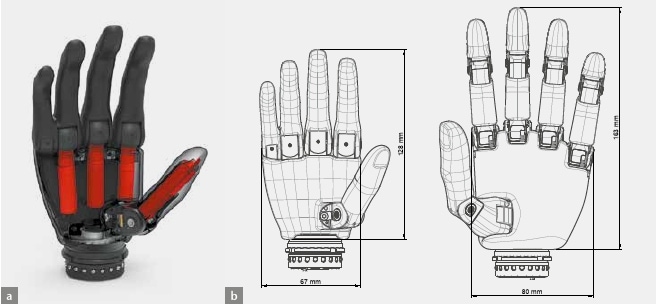 Die neue Prothese ist mit dem Ziel konzipiert worden, die Funktionalität einer multiartikulierenden Hand mit den anatomischen und ästhetischen Anforderungen an eine Kinder- und Jugendprothese zu verbinden. Gewicht, Größe und Form sollten daher dem natürlichen Vorbild entsprechen. Im Vergleich zur „VINCENTevolution2” wurde bei dem neuen Modell die Handlänge von 163 auf 128 mm und die Breite der Mittelhand von 80 auf 67 mm reduziert (Abb. 2a und 2b). Das anatomisch angenäherte Design des Vorgängers zeichnet sich aus durch eine flache und ausgeprägte Mittelhand und eine abgerundete Formensprache, die durch eine vollständige Ummantelung der Prothese mit elastischen Polyurethan-Formelementen unterschiedlicher Elastizität erreicht wird. Dieses Design konnte auch bei der neuen Hand erfolgreich umgesetzt werden. Die multiartikulierende Kinder- und Jugendhand hat inklusive einer Handgelenk-Verschlussautomatik ein Gewicht von ca. 285 g.