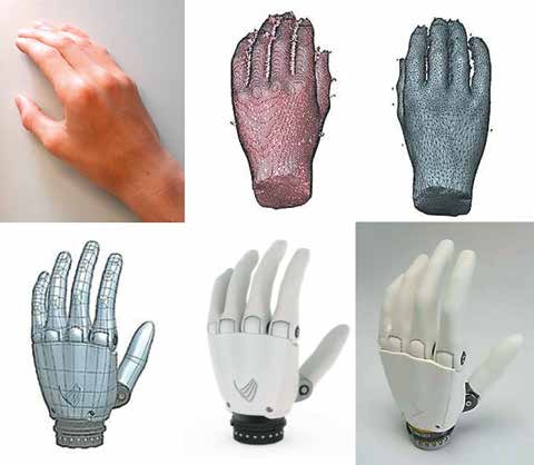 Der Designprozess der Kinderhand startete mit einem Gipsabdruck der rechten Hand eines zwölfjährigen Jungen, für dessen linken Unterarm eine prothetische Versorgung geplant war. Das Gipsmodell wurde zunächst mit einem hochauflösenden 3‑D-Scanner digitalisiert. Im CAD-System wurden die Daten dann gespiegelt und als Vorgabe für Form und Größe der zu entwickelnden Handprothese eingesetzt. Die Prothese wurde daraufhin mit allen Funktionsmerkmalen virtuell konstruiert, sodass ihre Kinematik und mechanische Belastung simuliert werden konnten. Auch der Designprozess bis hin zur farblichen Beschichtung, bis zur Wahl der Oberflächenstruktur aller sichtbaren Baugruppen und bis zur realitätsnahen Darstellung wurde im CAD-Prozess simuliert.