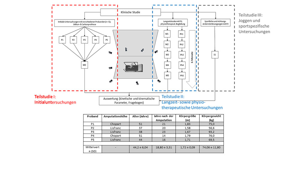 Im Rahmen einer klinischen Studie (DRKS, DRKS00011929) wurde eine individuell angepasste Carbonvorfußprothese (Fcade, Fa. Häussler Technische Orthopädietechnik GmbH, Ulm) vergleichend zu einer Silikonprothese bewertet. Die mechanische Auslegung der Prothesenfunktionsbereiche (Abb. 1, rechts) erfolgte anhand des jeweiligen Mobilitätswunsches der Studienteilnehmenden. Hiermit sollte eine Balance zwischen erforderlicher Prothesensteifigkeit und ‑flexibilität erreicht werden. Für die Studie wurde eine Probandengruppe (n = 5) von Vor- und Mittelfußamputierten mit Silikonprothese (SP) mit folgenden Ein- und Ausschlusskriterien akquiriert (Abb. 2, unten), bei denen die Amputation im Schnitt über 15 Jahre zurückliegt. Einschlusskriterien: einseitige Amputation entlang der Gelenklinien Lisfranc oder Chopart, Fähigkeit der eigenständigen Fortbewegung ohne Verwendung weiterer Hilfsmittel, maximales Körpergewicht von 135 kg; Ausschlusskriterien: Begleiterkrankungen (Diabetes mellitus, neuromuskuläre Erkrankungen), allgemein schlechter Gesundheitszustand, Körpergewicht über 135 kg.