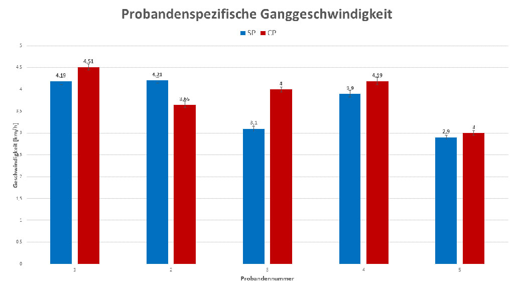 Die Ganggeschwindigkeit ist ein eindeutiger Parameter in Bezug auf das Wohlfühl- sowie Sicherheitsempfinden während des Tragens eines prothetischen Hilfsmittels. In der Literatur wird der Bereich zwischen 4,0 und 4,6 km/h als physiologisch für das ‚normale Gehen‘ angesehen20 21 22 23. Während der TS1 waren zwei Probanden mit der Silikonprothese und drei mit der Carbonprothese (CP) in der Lage, bei der angegebenen physiologischen Geschwindigkeit die Messung auf dem Laufband zu absolvieren (Abb. 4, links). Trotz der kurzen Eingewöhnungszeit waren vier Probanden in der Lage, die Ganggeschwindigkeit mit dem neuen Carbonhilfsmittel gegenüber den Probanden mit Silikonversorgung zu erhöhen. Lediglich P2 musste die Ganggeschwindigkeit um ca. 15 % reduzieren.