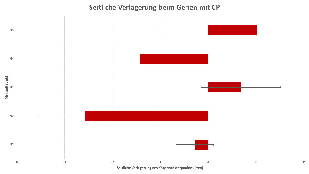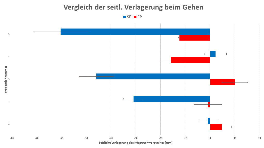 Ein weiterer Parameter, der bei Vor- und Mittelfußamputierten deutlich auffällt, ist die seitliche Verlagerung des Körperschwerpunktes in Richtung der Amputation. Diese Dysbalance der Biomechanik ist oftmals das Resultat aus einer Muskeldegeneration sowie einer Adaption des Bewegungsapparates zur Kompensation der amputierten Extremität. Nicht selten geht dieses Defizit mit Langzeitfolgen, wie beispielsweise einer Arthritis, einher24. Bereits während der Initialuntersuchung konnte der Absolutwert der seitlichen Verlagerung bei drei von fünf Probanden mit der CP um ein Vielfaches verringert werden (Abb. 4, rechts). Allerdings zeigt sich bei P3 eine Überkompensation, indem die Verlagerung auf die gesunde Seite wandert. Dies deutet auf eine nicht optimal angepasste Ausrichtung der Prothese relativ zur Beinachse hin und wurde im weiteren Verlauf der Studie korrigiert. Bei den Probanden 1 und 4 fiel die CP hinsichtlich des Absolutwertes der seitlichen Verlagerung schlechter aus. Beide Studienteilnehmenden schienen mehr Zeit zu benötigen, um sich an die veränderte Biomechanik mit der CP zu gewöhnen.